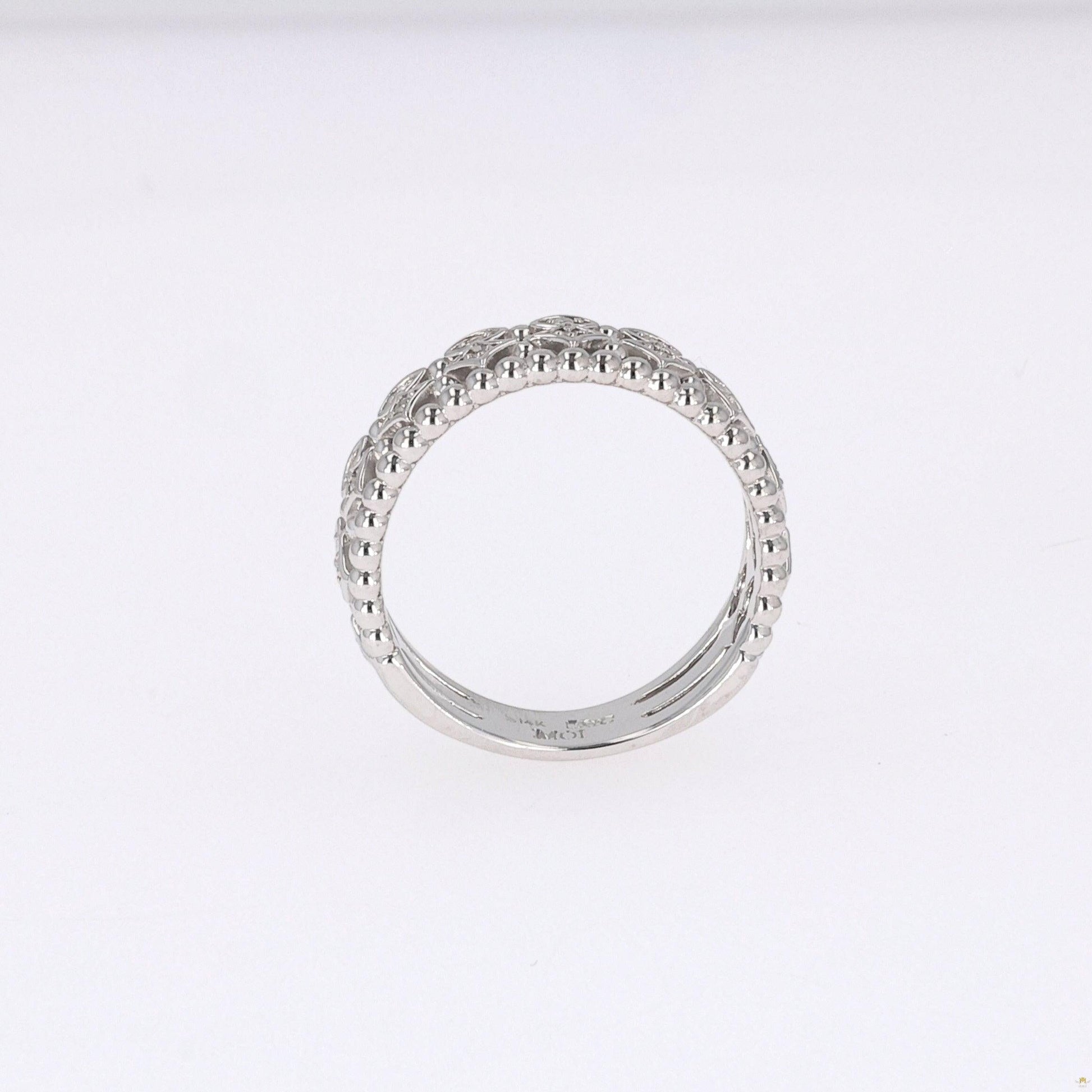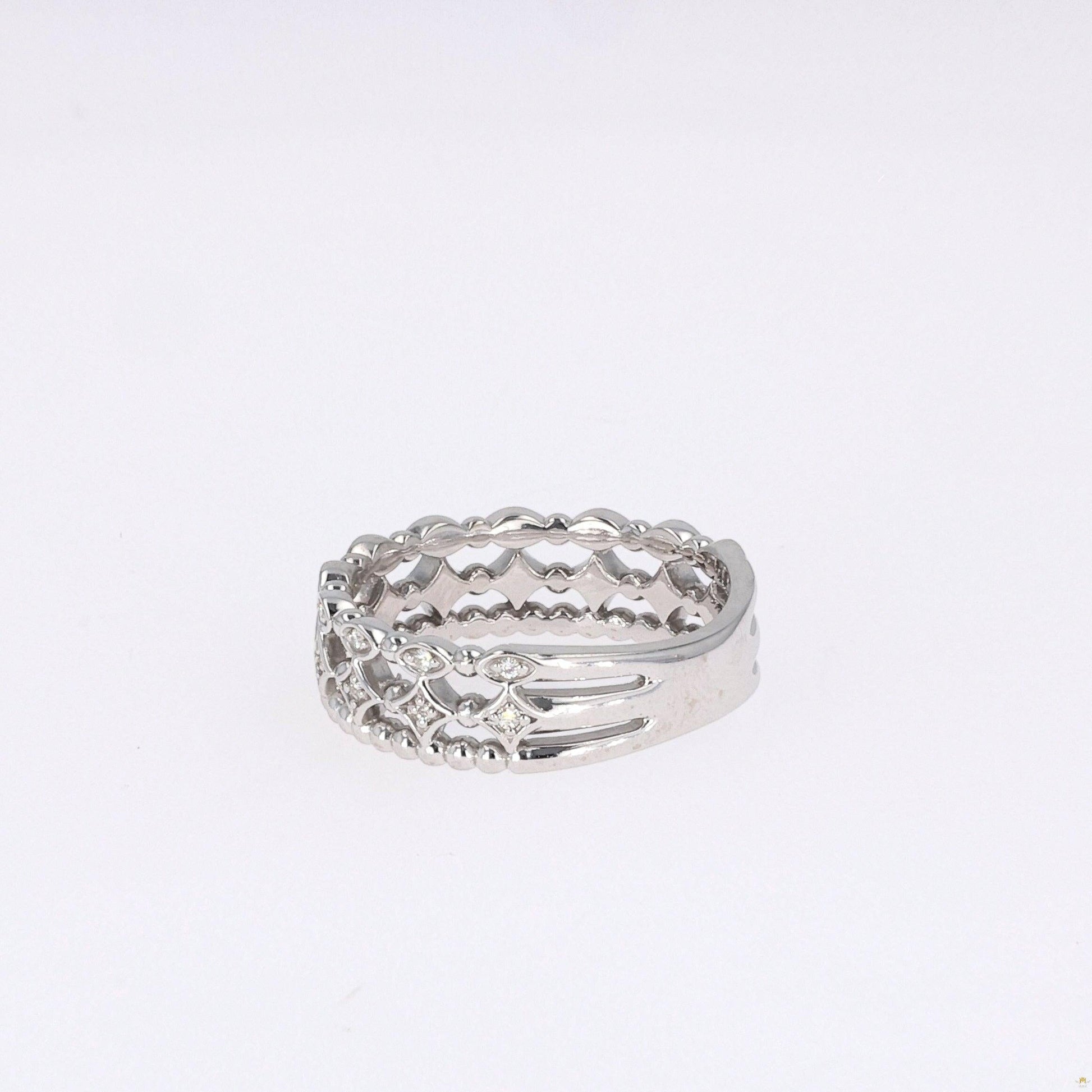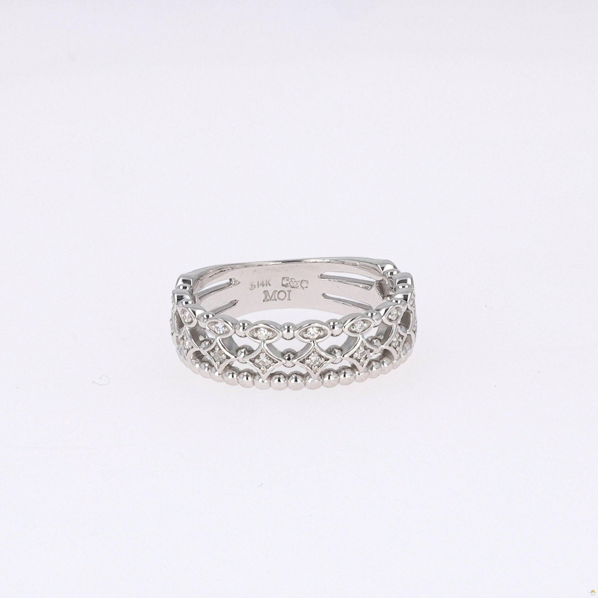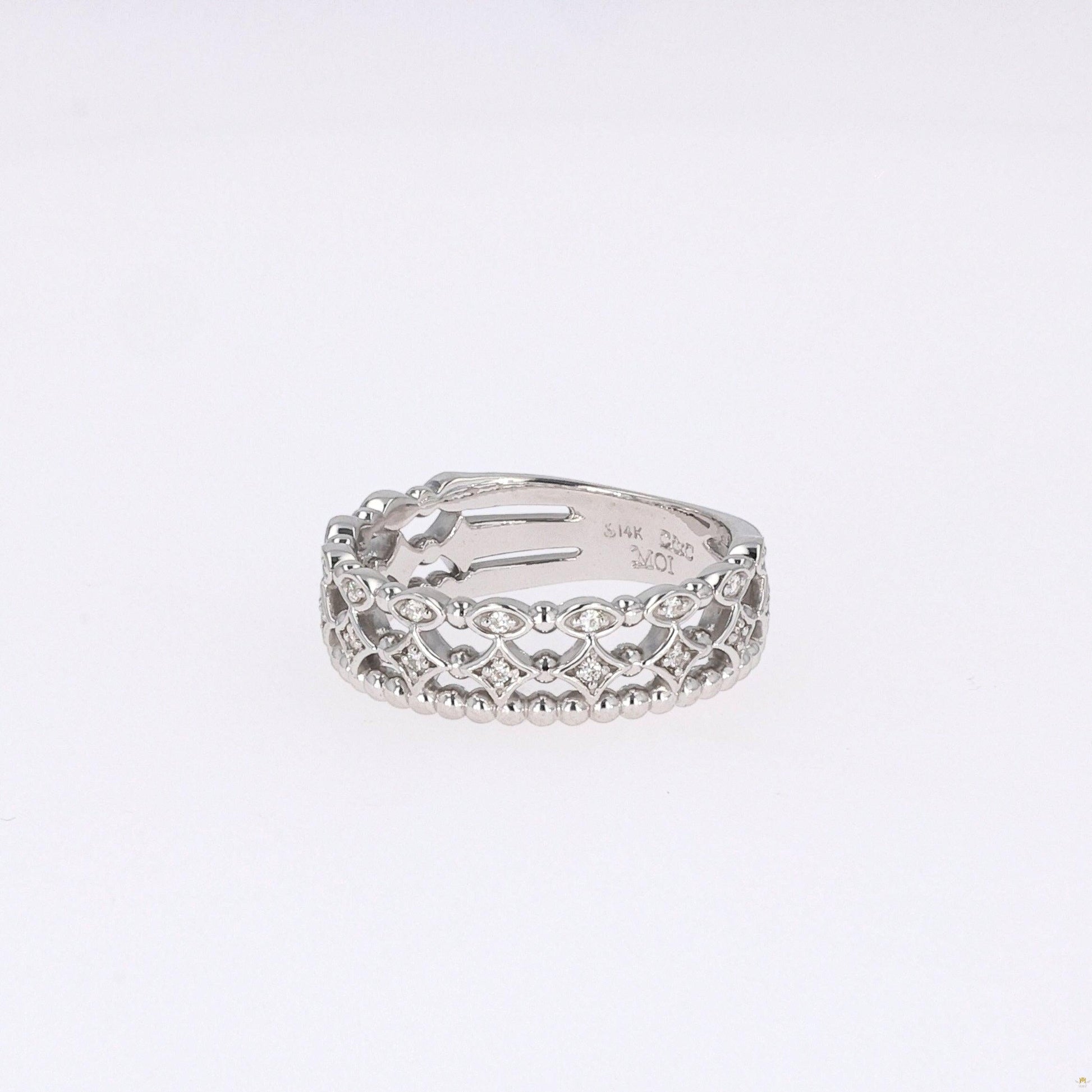 The epitome of when art meets fashion – this 14K white gold moissanite fashion band features 0.11 carats gemstone accents and an incredible geometric silhouette.