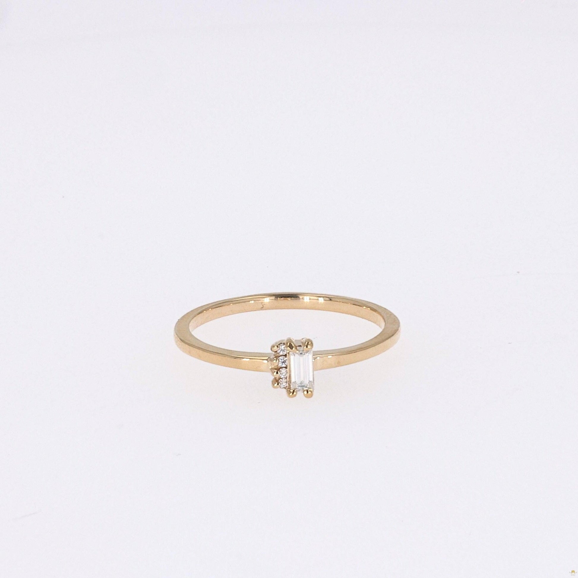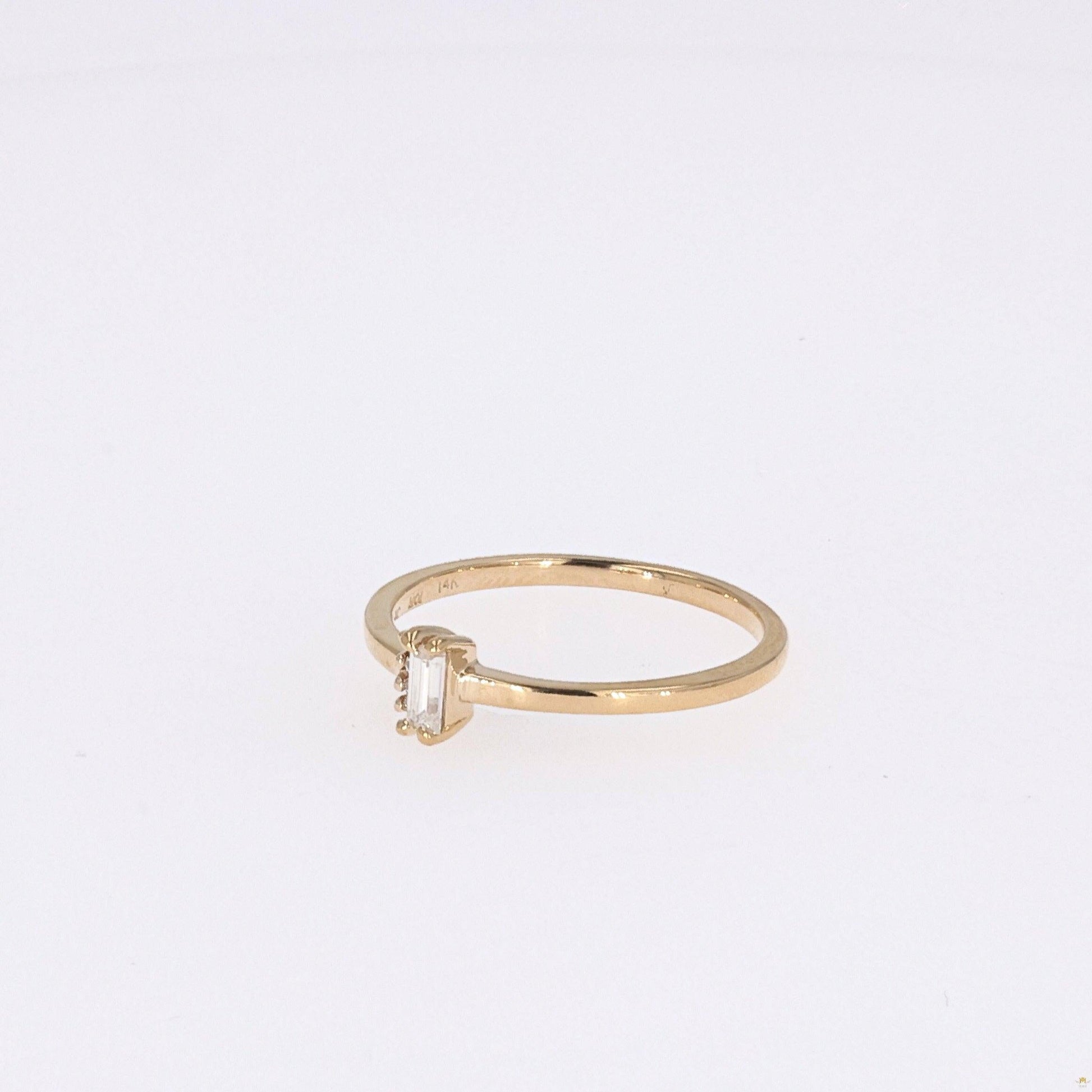 Simply elegant – this 0.14 carats 14K yellow gold, baguette moissanite fashion ring has subtle sparkle and big style.